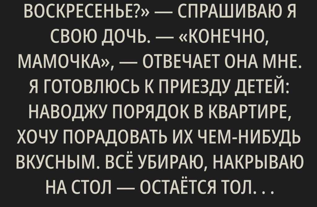 Я готовлюсь к приезду детей: наводжу порядок в квартире, хочу порадовать их чем-нибудь вкусным. Всё убираю, накрываю на стол остаётся только ждать гостей. В условленное время никто не появляется. Начинаю переживать, вдруг что-то случилось. Я ведь собиралась подарить им приличную сумму знала, как мечтают они о новой машине. Решаю позвонить дочери. Она отвечает сонным голосом: