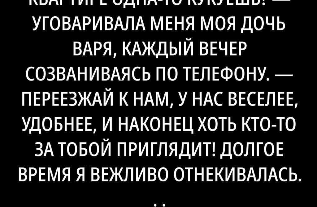 Мама, ну что ты там в своей квартире одна-то кукуешь? уговаривала меня моя дочь Варя, каждый вечер созваниваясь по телефону. Переезжай к нам, у нас веселее, удобнее, и наконец хоть кто-то за тобой приглядит!