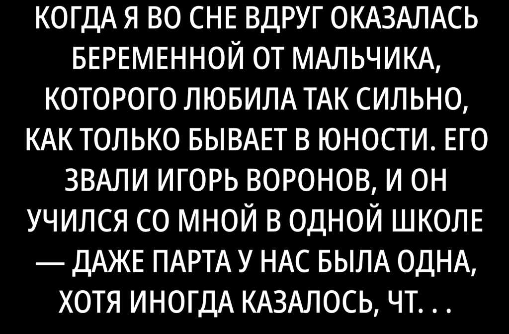 Мне было шестнадцать лет, когда я во сне вдруг оказалась беременной от мальчика, которого любила так сильно, как только бывает в юности. Его звали Игорь Воронов, и он учился со мной в одной школе даже парта у нас была одна, хотя иногда казалось, что она растягивается бесконечно из-за волнения. Мы тайком встречались целый год, а потом беременность как снег среди весны быстро и неожиданно. И мы обе были как тени, полные страха и неведомых мыслей, и решились ничего не говорить родителям.