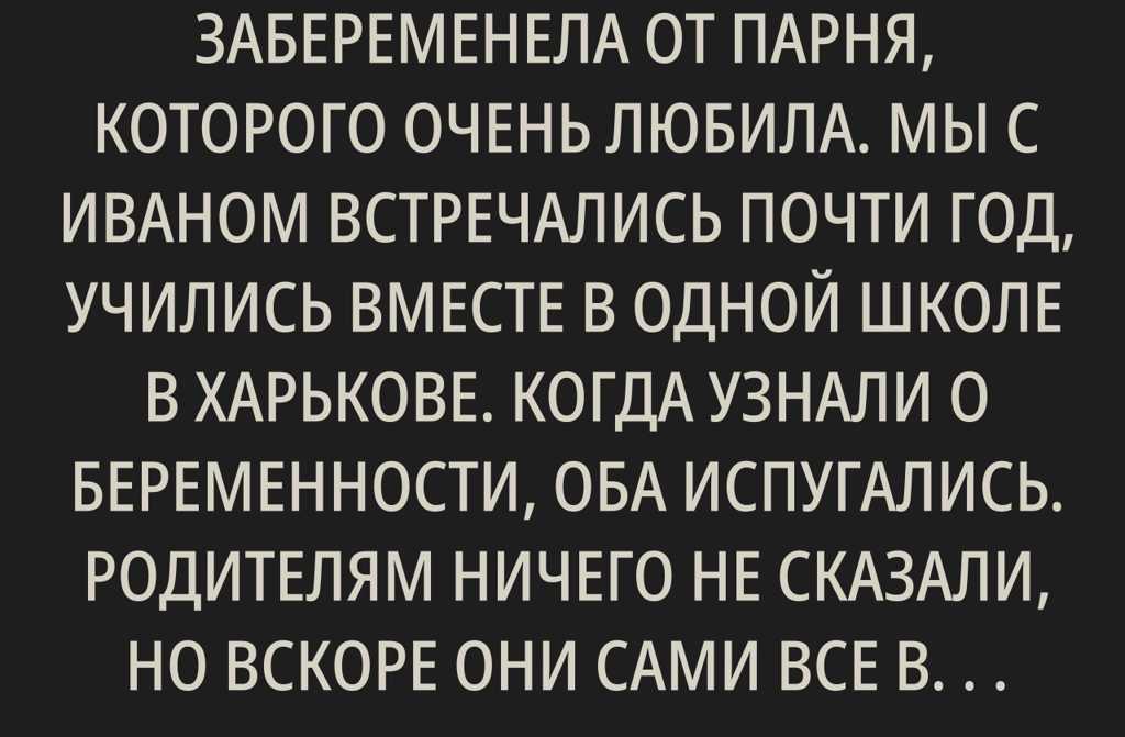 Мне было шестнадцать, когда я забеременела от парня, которого очень любила. Мы с Иваном встречались почти год, учились вместе в одной школе в Харькове. Когда узнали о беременности, оба испугались. Родителям ничего не сказали, но вскоре они сами все выяснили и, конечно, были в ужасе.