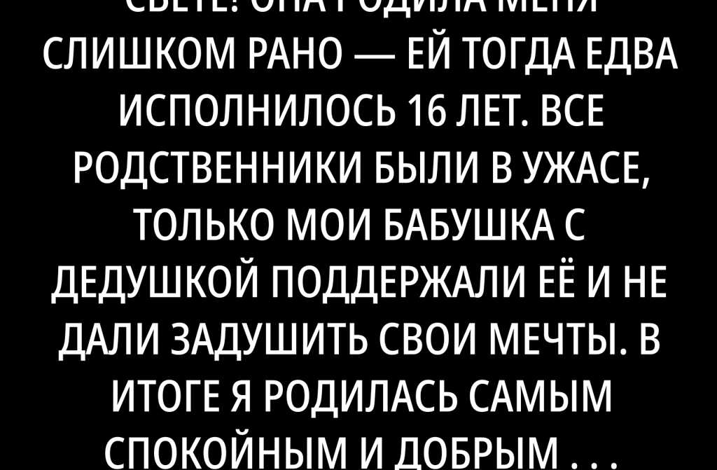 Я выросла, мне тоже исполнилось 16, и неожиданно я узнала, что беременна. Мой парень оказался настоящим мужчиной он взял на себя ответственность, женился на мне. В семнадцать я стала мамой. А мама в свои 33 года уже стала бабушкой! И никакой тоски, наоборот счастье на глазах. Опять вся семья растили вместе уже моего ребёнка. Я смогла закончить учёбу, устроиться на отличную работу.
