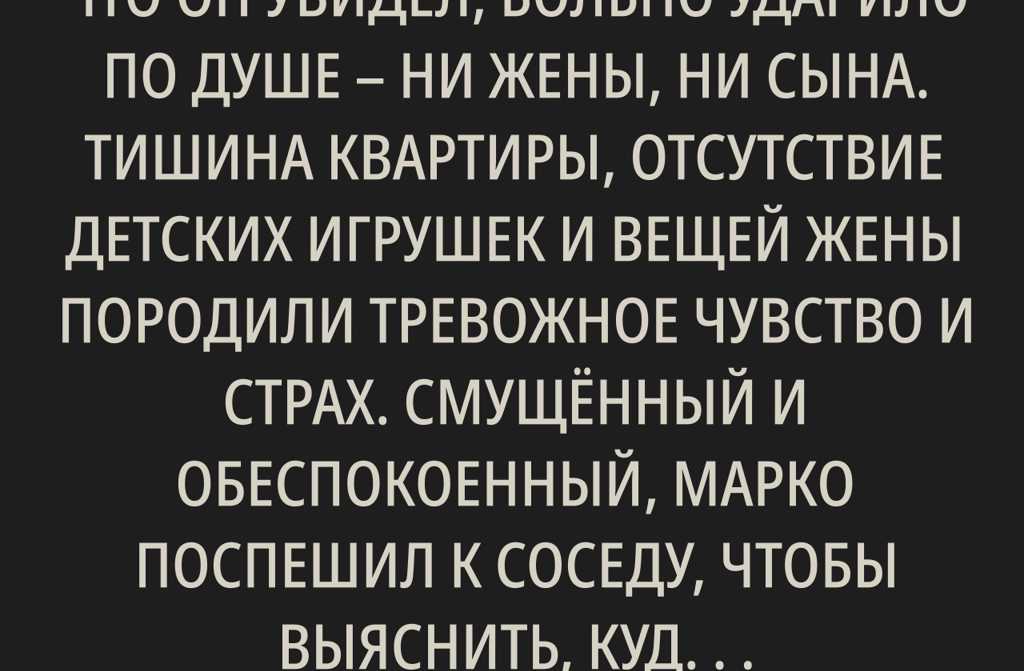 Марко вернулся домой, и то, что он увидел, больно ударило по душе ни жены, ни сына. Тишина квартиры, отсутствие детских игрушек и вещей жены породили тревожное чувство и страх. Смущённый и обеспокоенный, Марко поспешил к соседу, чтобы выяснить, куда исчезла его жена. Но, к удивлению, сосед Вячеслав вышел из своей квартиры, держа на руках годовалого сына Марко.