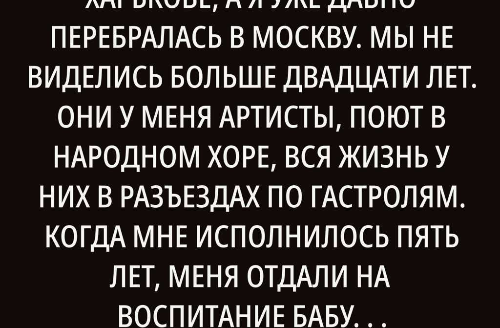 Мы не виделись больше двадцати лет. Они у меня артисты, поют в народном хоре, вся жизнь у них в разъездах по гастролям. Когда мне исполнилось пять лет, меня отдали на воспитание бабушке. Чтобы ей было полегче со мной, бабушка переехала к своим родственникам в Курскую область. Сначала мама с папой приезжали к нам пару иногда три раза в год, но потом их визиты становились всё реже и реже. В какой-то момент я просто перестала о них даже думать, потом и вовсе связь оборвалась. Когда я училась в медуниверситете, то на третьем курсе уже вышла замуж.