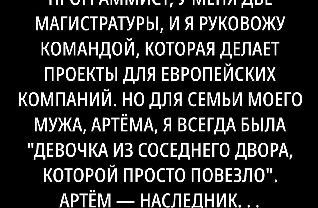 Но для семьи моего мужа, Артёма, я всегда была “девочка из соседнего двора, которой просто повезло”.