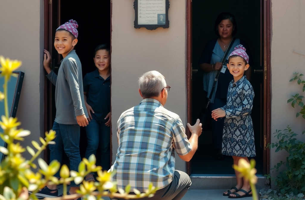 Привет, сказал Михаил мальчику, который осторожно выглянул из-за двери, сжимая игрушку.