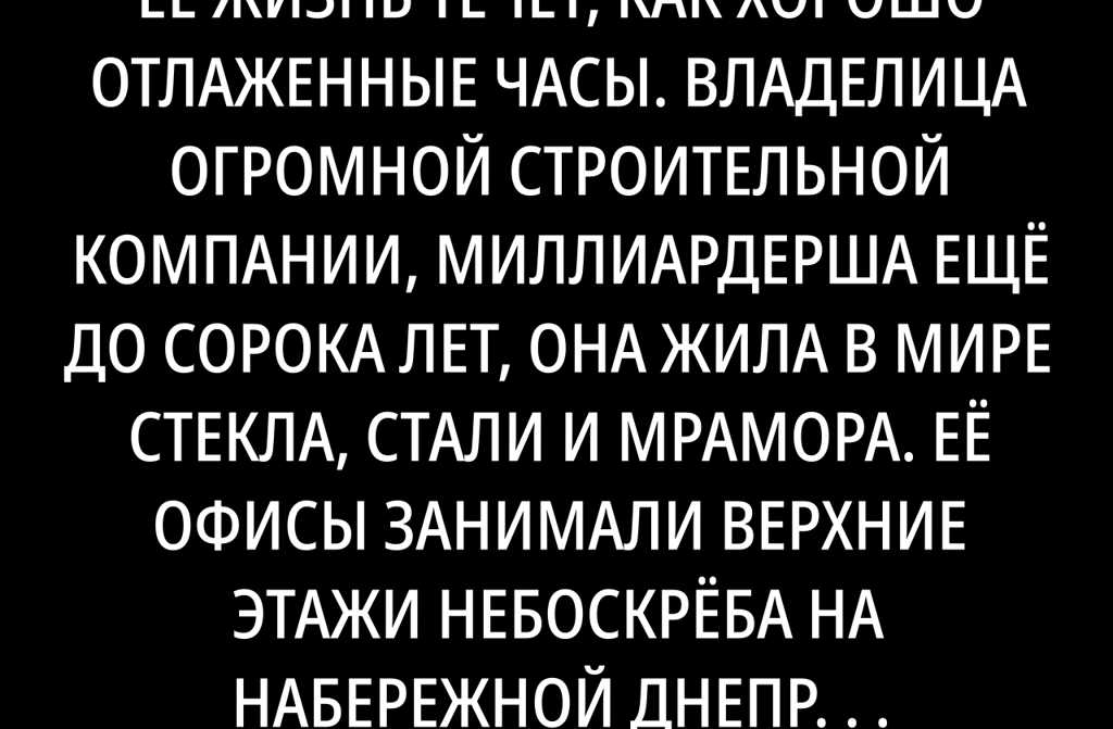 Ольга Полякова привыкла, что её жизнь течёт, как хорошо отлаженные часы. Владелица огромной строительной компании, миллиардерша ещё до сорока лет, она жила в мире стекла, стали и мрамора. Её офисы занимали верхние этажи небоскрёба на набережной Днепра, а её пентхаус не раз появлялся на страницах глянцевых журналов про бизнес и архитектуру. В её мире люди двигались быстро, подчинялись молча, времени на жалости и слабости не было.