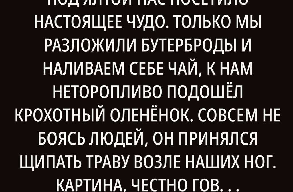 Сегодня за обедом на террасе под Ялтой нас посетило настоящее чудо. Только мы разложили бутерброды и наливаем себе чай, к нам неторопливо подошёл крохотный оленёнок. Совсем не боясь людей, он принялся щипать траву возле наших ног. Картина, честно говоря, умиляла до глубины души. Но на этом сюрпризы не закончились: вдруг откуда-то из-за кустов, буквально на лету, выскочил второй оленёнок и, перепрыгнув через лавку, стал лизать лицо Зинаиды! Удивление на её лице сменилось искренним смехом и радостью.