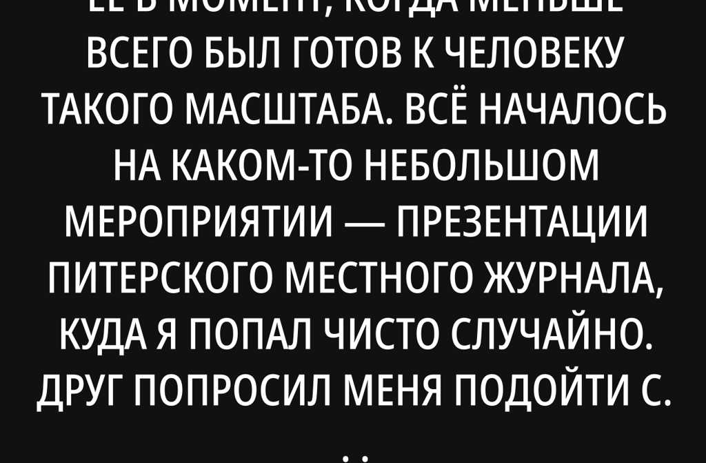 Слушай, мне 27 лет, и я встретил её в момент, когда меньше всего был готов к человеку такого масштаба. Всё началось на каком-то небольшом мероприятии презентации питерского местного журнала, куда я попал чисто случайно. Друг попросил меня подойти с ним, нужен был кто-то, чтобы поносить коробки, а у меня особо никаких планов не было, да и пару гривен заработать хотелось, поэтому я согласился.