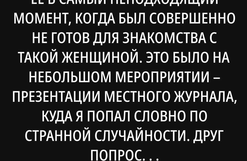 Мне двадцать семь, и я встретил её в самый неподходящий момент, когда был совершенно не готов для знакомства с такой женщиной.