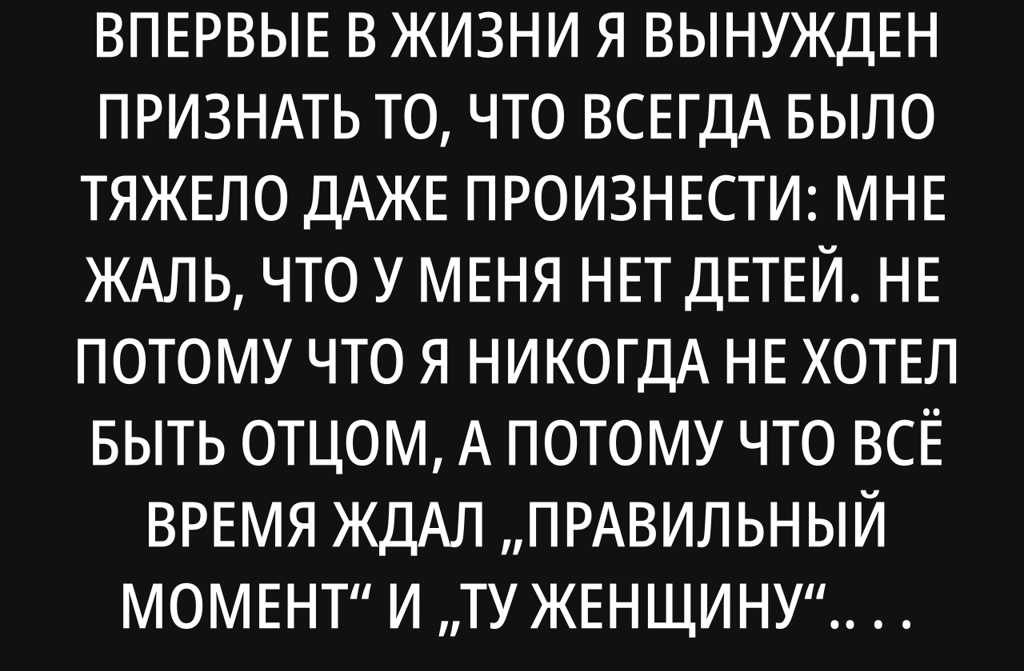 Мне сейчас тридцать девять, и впервые в жизни я вынужден признать то, что всегда было тяжело даже произнести: мне жаль, что у меня нет детей. Не потому что я никогда не хотел быть отцом, а потому что всё время ждал правильный момент и ту женщину. Более пятнадцати лет я строил отношения с мыслью, что если она не моя, то не стоит приводить ребёнка в этот мир. Так год за годом время ускользало.
