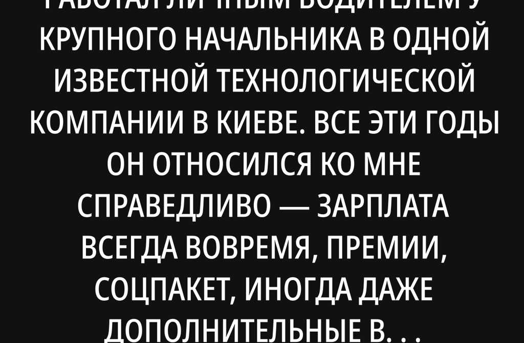 Мне 47 лет. Уже пятнадцать лет я работал личным водителем у крупного начальника в одной известной технологической компании в Киеве. Все эти годы он относился ко мне справедливо зарплата всегда вовремя, премии, соцпакет, иногда даже дополнительные выплаты. Я возил его повсюду: на переговоры, в аэропорт, на деловые ужины, а иногда и на семейные мероприятия.