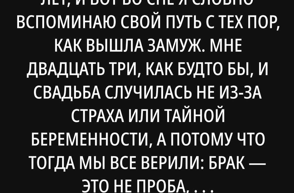 Мне сейчас шестьдесят пять лет, и вот во сне я словно вспоминаю свой путь с тех пор, как вышла замуж. Мне двадцать три, как будто бы, и свадьба случилась не из-за страха или тайной беременности, а потому что тогда мы все верили: брак это не проба, не эксперимент, а будто бы обязательство, как старое правило Москвы или затаённый закон в Харькове. Мы оба работали, почти не понимали друг друга с утра в метро, но думали, что остальное придёт с годами, как снег на крышах.