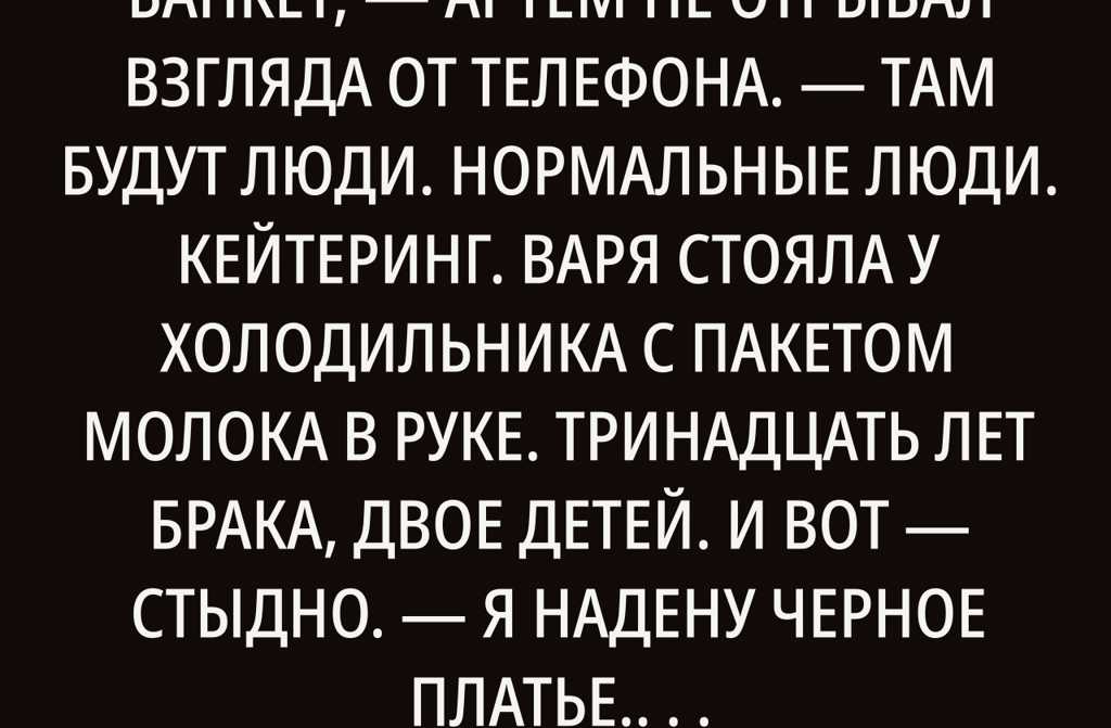 Мне стыдно брать тебя на банкет, Артем не отрывал взгляда от телефона. Там будут люди. Нормальные люди. Кейтеринг.