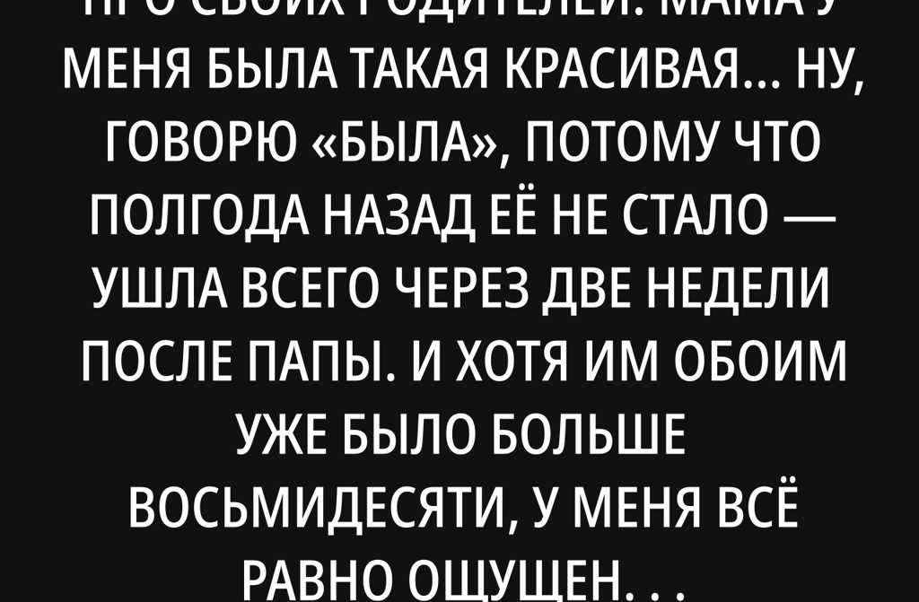 Слушай, хочу рассказать тебе про своих родителей. Мама у меня была такая красивая Ну, говорю «была», потому что полгода назад её не стало ушла всего через две недели после папы. И хотя им обоим уже было больше восьмидесяти, у меня всё равно ощущение, будто прожили мало, ведь это же мои мама с папой.