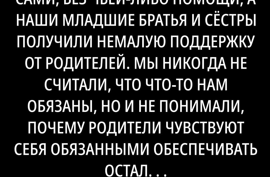 Всё то неравенство в родителях, которые всегда ставили младших впереди, а нам доставались только крохи, ранит и сейчас. Тяжело понять, почему к родным детям такие разные стандарты и с этим ощущением обиды, тяжести и несправедливости мы так и живём.