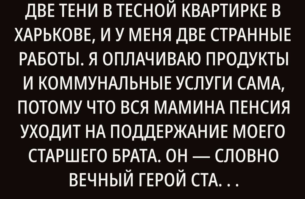 Я живу вместе с мамой, словно две тени в тесной квартирке в Харькове, и у меня две странные работы. Я оплачиваю продукты и коммунальные услуги сама, потому что вся мамина пенсия уходит на поддержание моего старшего брата. Он словно вечный герой старых сказок, всегда нуждающийся, всегда требующий. Я подрабатываю в ночных сменах, собирая гривны для своей несбыточной мечты купить собственную квартиру. Каждое утро я балансирую между счетами и сбережениями, будто акробат на ветке кленового дерева пока сквозь окно улица гудит и мокрые облака ползут по синеве.