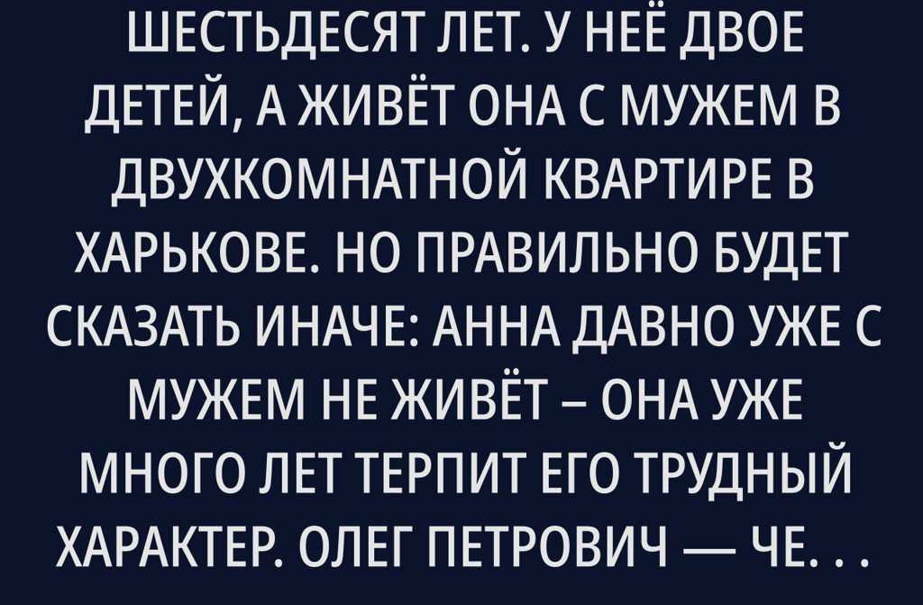 Анна Владимировна прожила шестьдесят лет. У неё двое детей, а живёт она с мужем в двухкомнатной квартире в Харькове. Но правильно будет сказать иначе: Анна давно уже с мужем не живёт она уже много лет терпит его трудный характер. Олег Петрович человек горделивый, эгоистичный, с тяжёлым, грубым нравом. Всё дома должно быть так, как хочет он, и никакие семейные разговоры не помогают. Анна держит всё в себе ради детей.