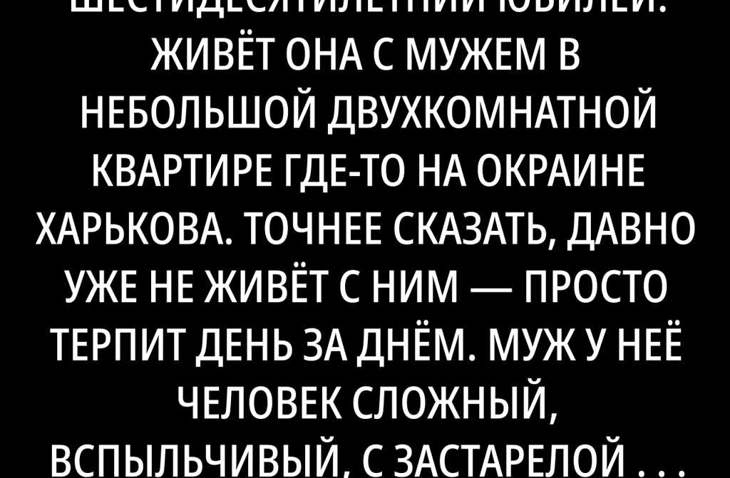 Анна отметила свой шестидесятилетний юбилей. Живёт она с мужем в небольшой двухкомнатной квартире где-то на окраине Харькова. Точнее сказать, давно уже не живёт с ним просто терпит день за днём. Муж у неё человек сложный, вспыльчивый, с застарелой гордыней и эгоизмом. Всё в доме должно быть только по его правилам, а на чужие чувства он давно махнул рукой. Терпела Анна этот характер всю совместную жизнь ради детей их двух.