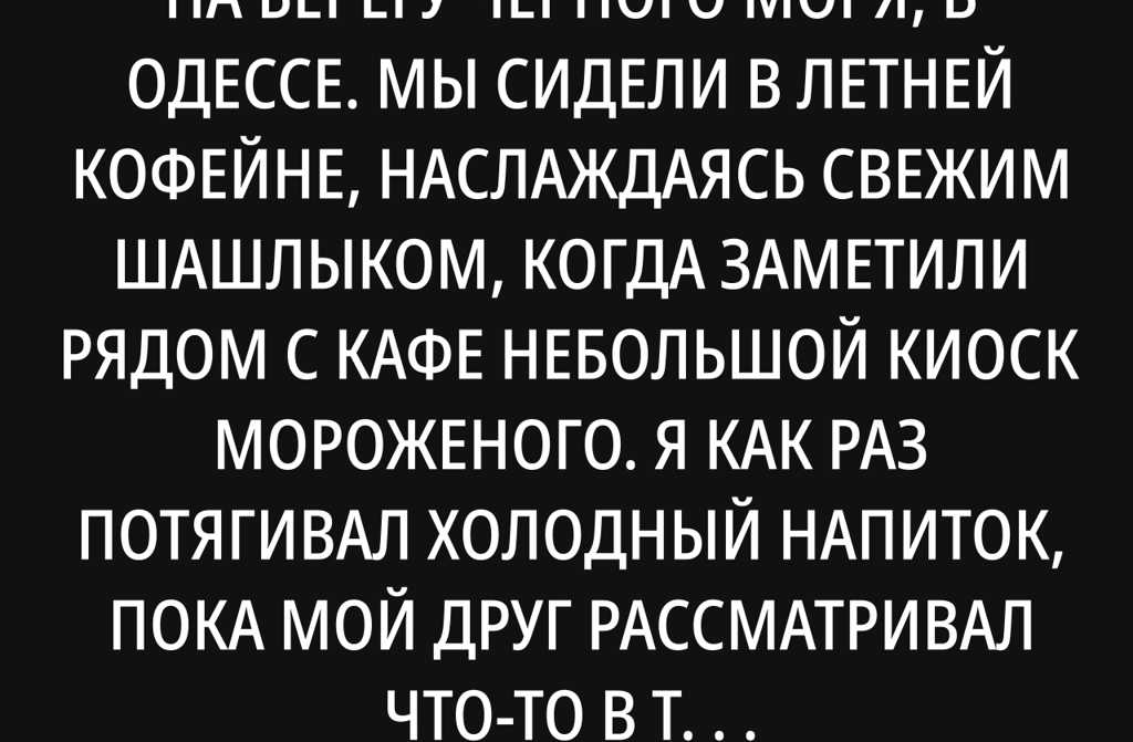 Однажды, я отдыхал с другом на берегу Чёрного моря, в Одессе. Мы сидели в летней кофейне, наслаждаясь свежим шашлыком, когда заметили рядом с кафе небольшой киоск мороженого. Я как раз потягивал холодный напиток, пока мой друг рассматривал что-то в телефоне, и вдруг мы увидели, что около киоска собралась толпа людей с мороженым в руках. Мой друг, Игорь, был любопытный, и мы подошли ближе.