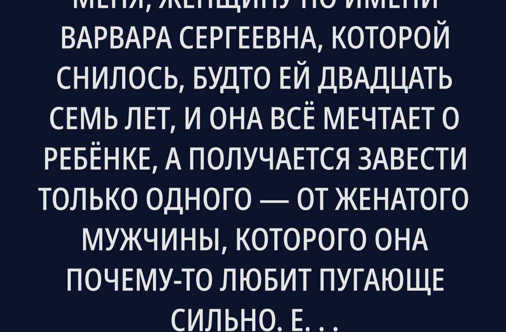 Это была странная история про меня, женщину по имени Варвара Сергеевна, которой снилось, будто ей двадцать семь лет, и она всё мечтает о ребёнке, а получается завести только одного от женатого мужчины, которого она почему-то любит пугающе сильно. Его зовут Павел Андреевич, и почему-то ему никак не позволяет совесть бросить жену, чтобы быть со мной, хотя в этом сне всё возможно. Так я осталась беременна живот рос каждую ночь, а любовь моя поддерживал меня только отдалённо, будто через густой туман.