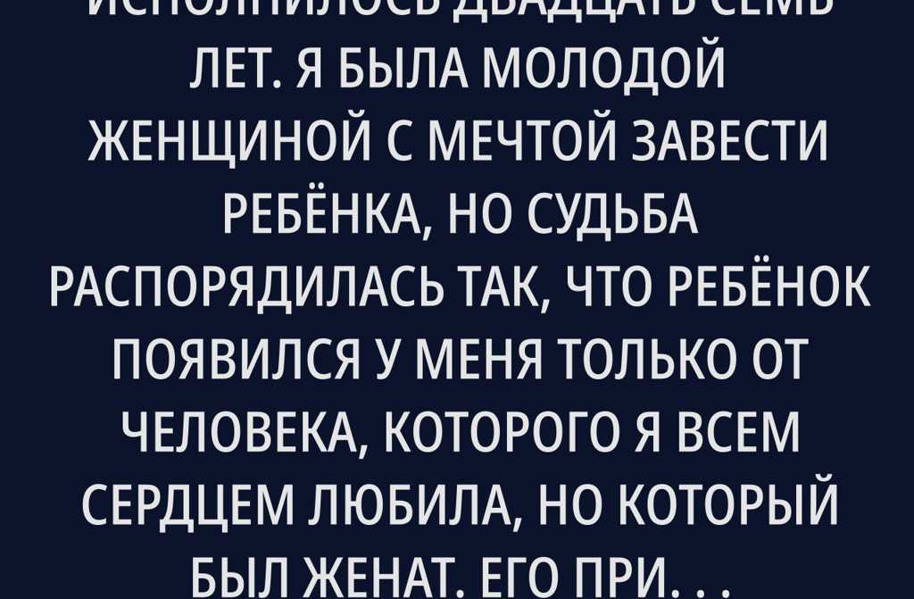 Это был далекий год, когда мне исполнилось двадцать семь лет. Я была молодой женщиной с мечтой завести ребёнка, но судьба распорядилась так, что ребёнок появился у меня только от человека, которого я всем сердцем любила, но который был женат. Его принципы и убеждения не позволяли ему уйти из семьи и развестись с женой, чтобы быть со мной. В итоге я осталась одна и забеременела. Несмотря на то, что он поддерживал меня чем мог, от близких у меня осталось мало поддержки кроме отца, лишь немногие остались рядом.