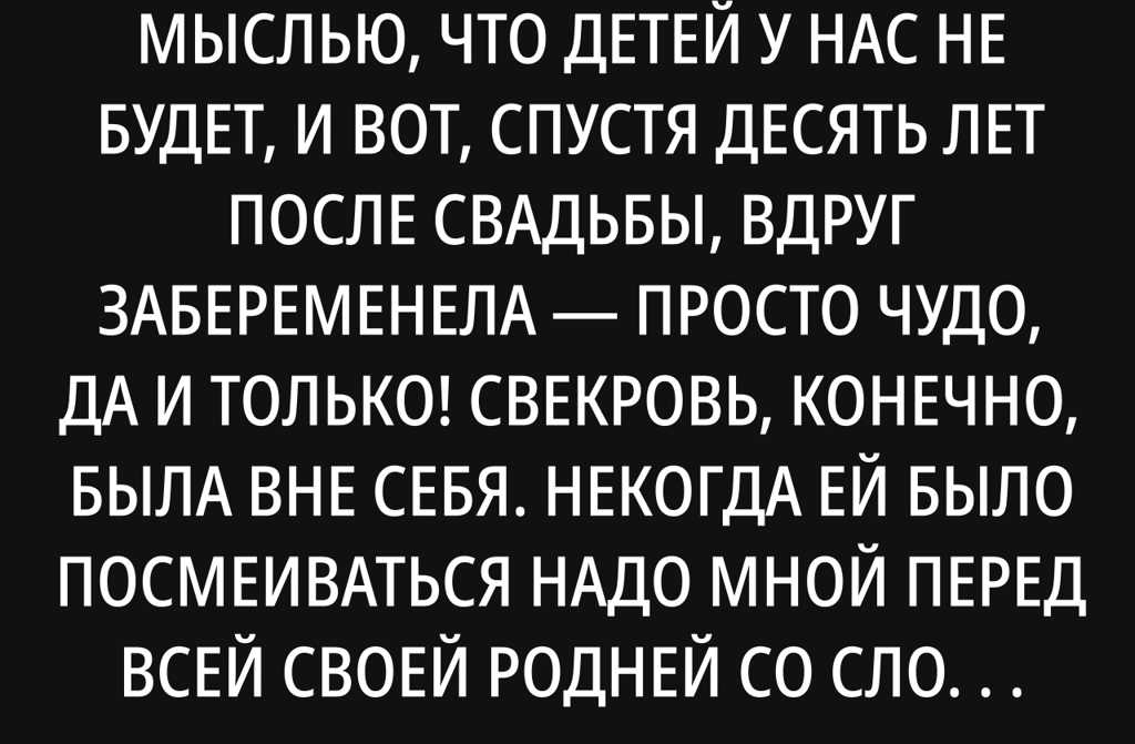 Свекровь, конечно, была вне себя. Некогда ей было посмеиваться надо мной перед всей своей родней со словами: «Видимо, от моего сына внуков не дождусь невестка-то у нас бесплодная!» Хотя у неё, между прочим, уже и правнучка есть дочка старшего сына. Как я ненавидела все эти разговоры… Но пришлось молча терпеть, неоднократно.