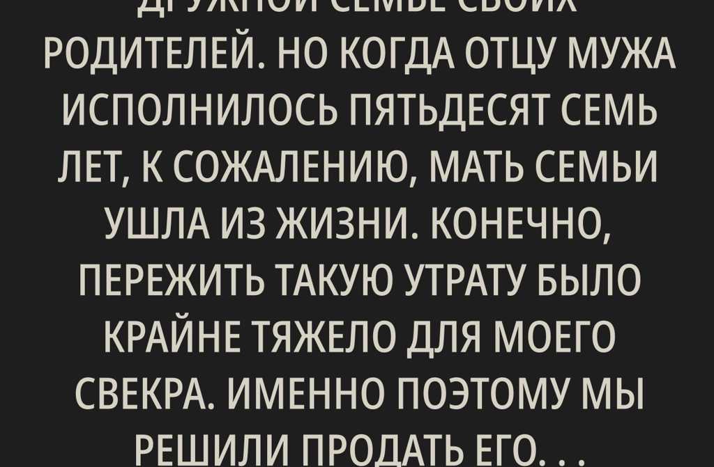 Мой муж вырос в теплой и дружной семье своих родителей. Но когда отцу мужа исполнилось пятьдесят семь лет, к сожалению, мать семьи ушла из жизни. Конечно, пережить такую утрату было крайне тяжело для моего свекра. Именно поэтому мы решили продать его квартиру, поделить вырученные гривны между нашей и братской семьями, и забрать свекра к себе, чтобы поддержать его, пока он не придет в себя. Так все и произошло.