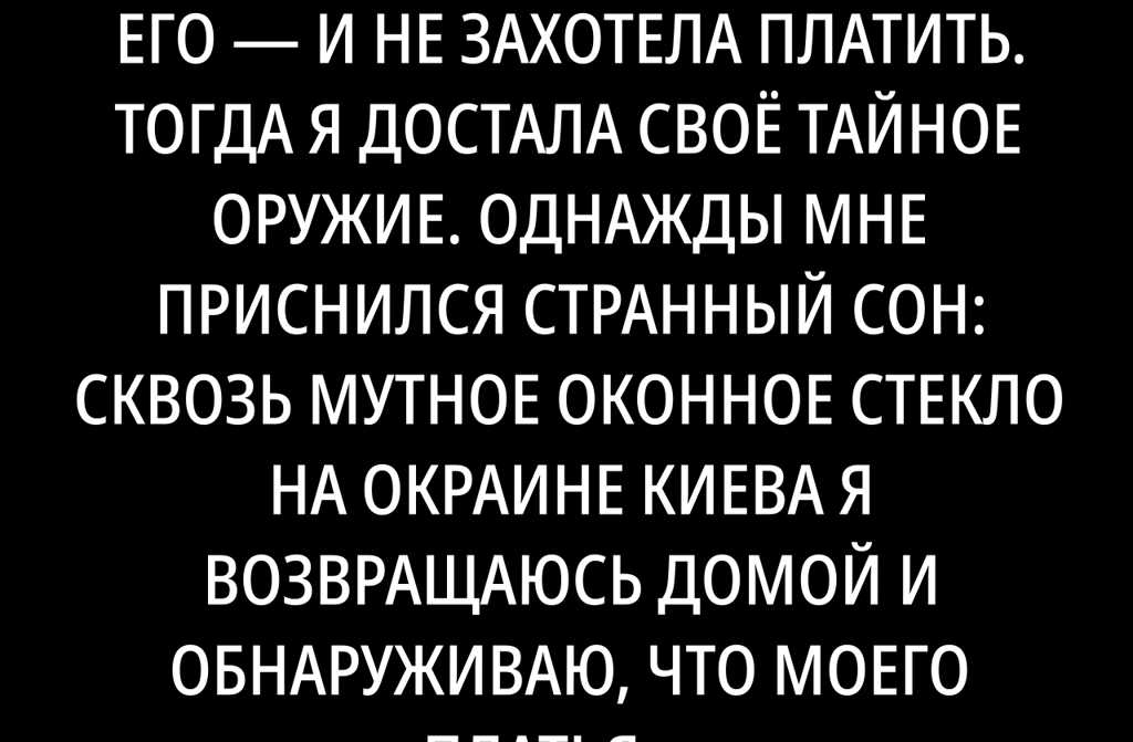 Однажды мне приснился странный сон: сквозь мутное оконное стекло на окраине Киева я возвращаюсь домой и обнаруживаю, что моего платья за 110000 гривен больше нет. Всё начинается с того, что моя будущая свекровь, Галина Алексеевна, уже много недель буквально дышит мне в спину своими сообщениями: “Ну нашла ли ты уже себе платье?”, “Смотри, Мариша, выбери что-нибудь приличное, а не то, что на чебурека похоже.”