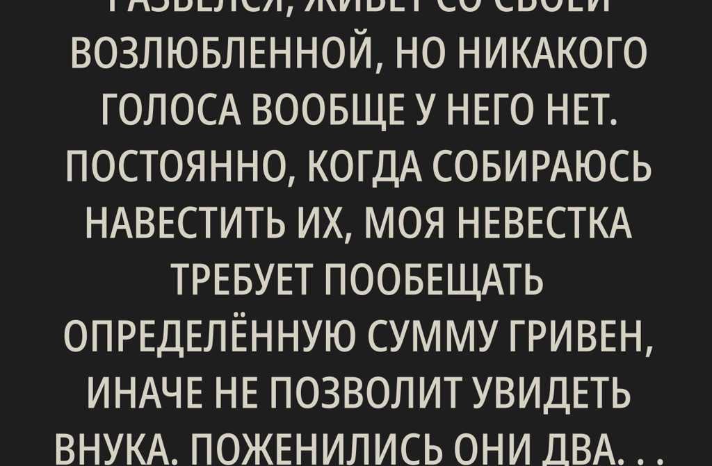Сын мой официально не развёлся, живёт со своей возлюбленной, но никакого голоса вообще у него нет. Постоянно, когда собираюсь навестить их, моя невестка требует пообещать определённую сумму гривен, иначе не позволит увидеть внука.