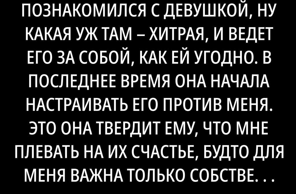 Мой сын когда-то познакомился с девушкой, ну какая уж там хитрая, и ведет его за собой, как ей угодно. В последнее время она начала настраивать его против меня. Это она твердит ему, что мне плевать на их счастье, будто для меня важна только собственная выгода. Такие выводы она сделала после того, как я не согласилась поменяться с ними квартирами.
