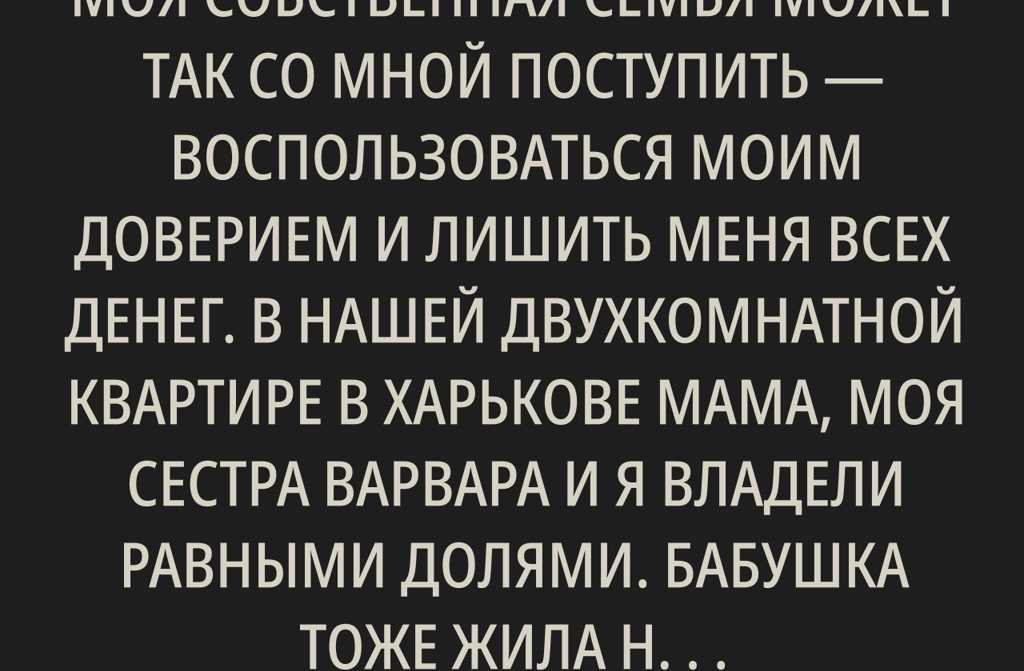 Никогда бы не подумала, что моя собственная семья может так со мной поступить воспользоваться моим доверием и лишить меня всех денег. В нашей двухкомнатной квартире в Харькове мама, моя сестра Варвара и я владели равными долями. Бабушка тоже жила неподалёку, у неё была двухкомнатная квартира, и она обещала составить завещание так, чтобы мы с Варварой унаследовали по половине её жилплощади. Мы договорились: когда наступит время, вместе решим, кто будет там жить, или же продадим квартиру и поделим сумму поровну. В то время Варвара уже перебралась к маме из-за незапланированной беременности, а я училась в университете во Львове.