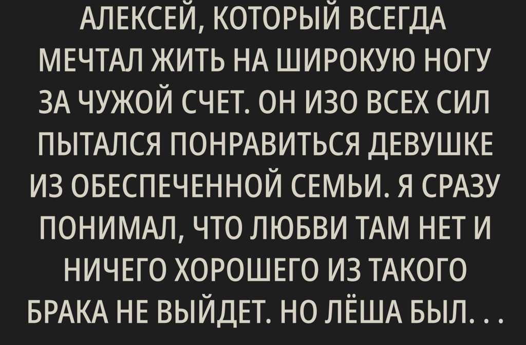 У меня был друг по имени Алексей, который всегда мечтал жить на широкую ногу за чужой счет. Он изо всех сил пытался понравиться девушке из обеспеченной семьи. Я сразу понимал, что любви там нет и ничего хорошего из такого брака не выйдет. Но Лёша был уверен: богатая жена это ключ к его беззаботному и счастливому будущему. В это можно было бы поверить, если бы сама девушка умела зарабатывать. Но богаты они были только потому, что мать девушки владела несколькими крупными магазинами в Киеве.