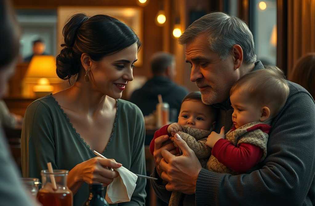 Анна замерла с вилкой в воздухе и обернулась к мужчине, стоявшему на коленях у её стола. Ему не было и тридцати пяти, но жизнь состарила его раньше времени. К груди тряпицей были привязаны двое крошечных младенцев бледные, исхудавшие личики. На нём были рваные джинсы и заляпанная пылью майка. Он дрожал не от страха, а от усталости. Но в его глазах не было стыда, только отчаянная любовь отца.