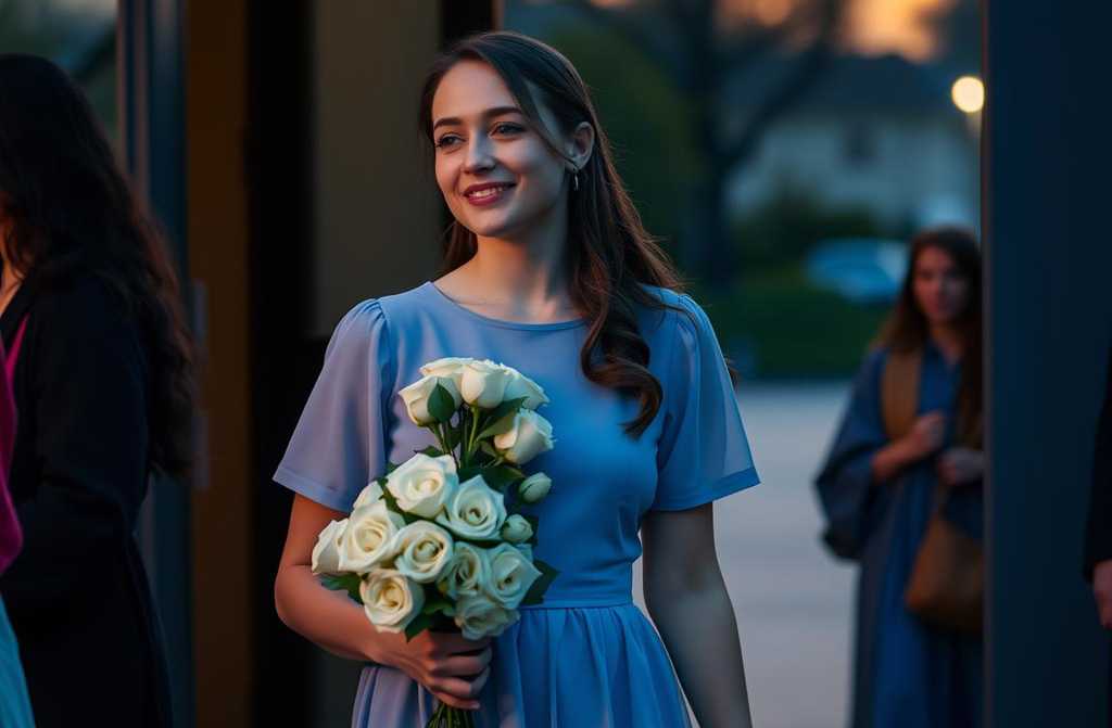 В день выпускного я пришла в парикмахерскую, сделала лёгкую укладку, нанесла макияж, надела то самое синее платье, каблуки, посмотрела в зеркало сорок два, седина под краской, морщины под тоналом, но всё ещё женщина. Я взяла букет белых роз, вызвала такси и направилась к школе.