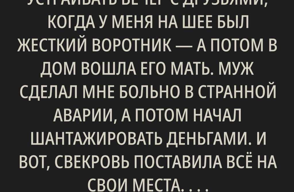 Мой муж заставил меня устраивать вечер с друзьями, когда у меня на шее был жесткий воротник а потом в дом вошла его мать.