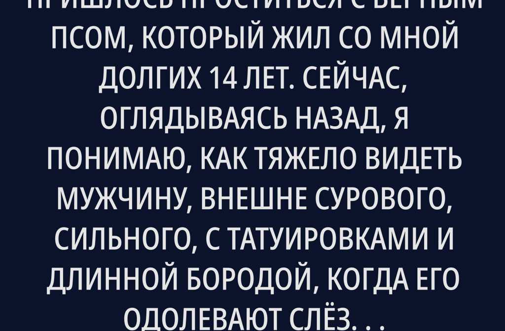 Трудно забыть тот день, когда пришлось проститься с верным псом, который жил со мной долгих 14 лет. Сейчас, оглядываясь назад, я понимаю, как тяжело видеть мужчину, внешне сурового, сильного, с татуировками и длинной бородой, когда его одолевают слёзы. Но ничто не может сдержать боль, когда настает время отпускать своего лучшего четвероногого друга, с которым пройдено столько дорог.
