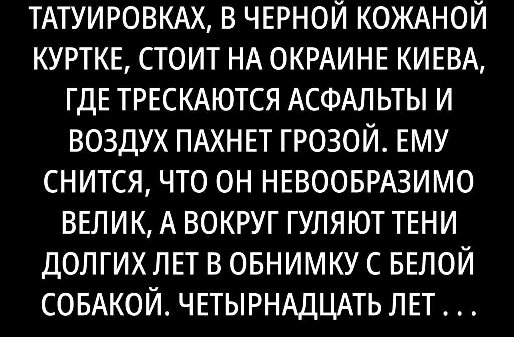 Мужчина с бородой, вся в татуировках, в черной кожаной куртке, стоит на окраине Киева, где трескаются асфальты и воздух пахнет грозой. Ему снится, что он невообразимо велик, а вокруг гуляют тени долгих лет в обнимку с белой собакой. Четырнадцать лет они вместе бродили по забытым улочкам, собирали каштаны под дождями, перепрыгивали лужи столько раз, что стала путаться реальность.