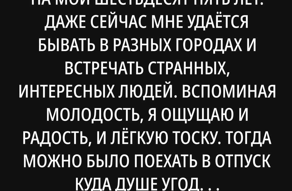 Я активная женщина, несмотря на мои шестьдесят пять лет. Даже сейчас мне удаётся бывать в разных городах и встречать странных, интересных людей. Вспоминая молодость, я ощущаю и радость, и лёгкую тоску. Тогда можно было поехать в отпуск куда душе угодно: на Балтийское море, к друзьям на рыбалку, в палатке с коллегами, на речной пароходике по Днепру. Всё это было доступно за копейки несколько гривен, и ты уже далеко от дома.