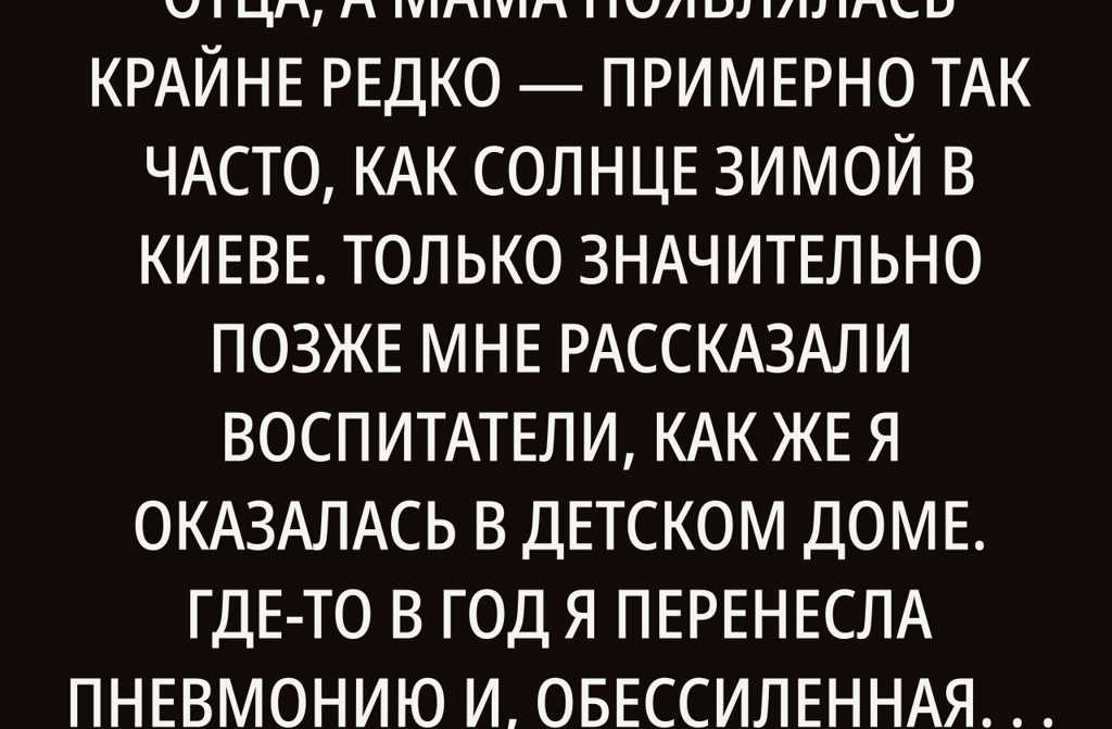 Я никогда не видела своего отца, а мама появлялась крайне редко примерно так часто, как солнце зимой в Киеве. Только значительно позже мне рассказали воспитатели, как же я оказалась в детском доме. Где-то в год я перенесла пневмонию и, обессиленная болезнью, просто перестала плакать. Несколько дней я тихо лежала в кроватке и медленно угасала, пока моя печальная мама утоляла свою тоску водкой в соседней комнате.