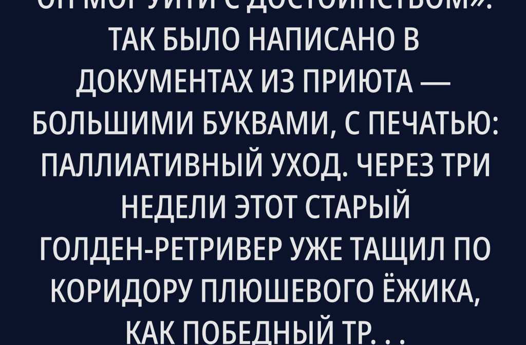 Через три недели этот старый голден-ретривер уже тащил по коридору плюшевого ёжика, как победный трофей.