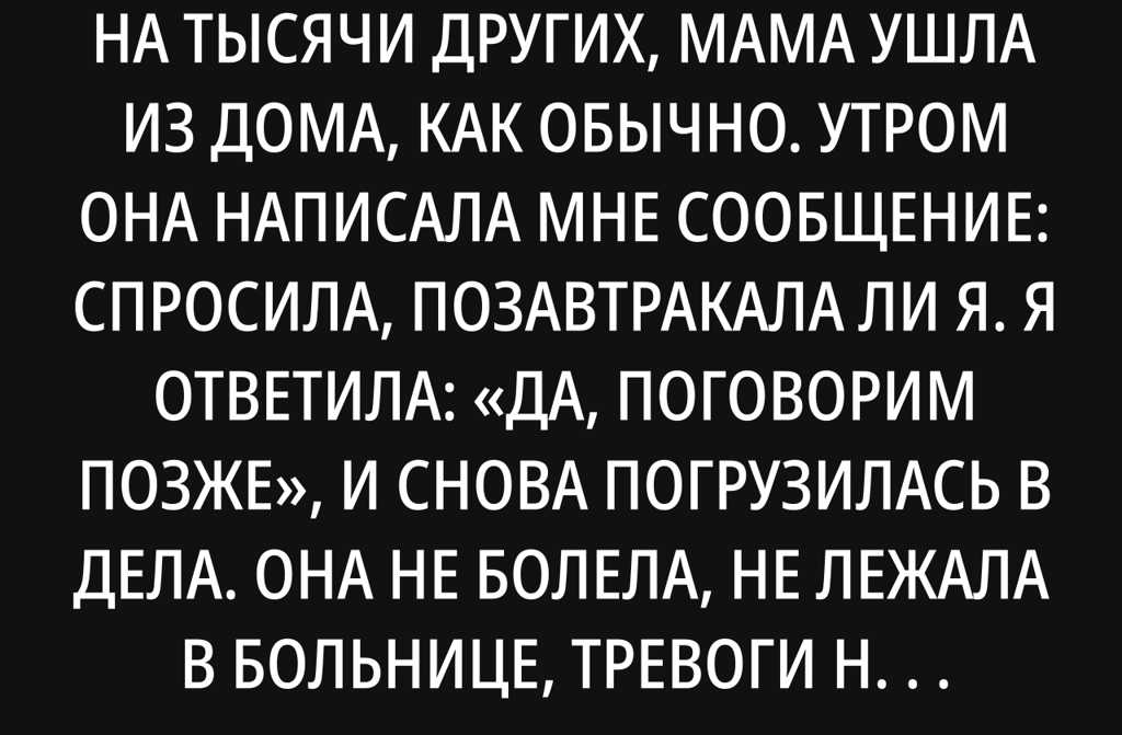 В тот странный день, похожий на тысячи других, мама ушла из дома, как обычно. Утром она написала мне сообщение: спросила, позавтракала ли я. Я ответила: «Да, поговорим позже», и снова погрузилась в дела. Она не болела, не лежала в больнице, тревоги не было, прощания тоже. Обычный день, такой, каким кажется, что ничего не изменится.