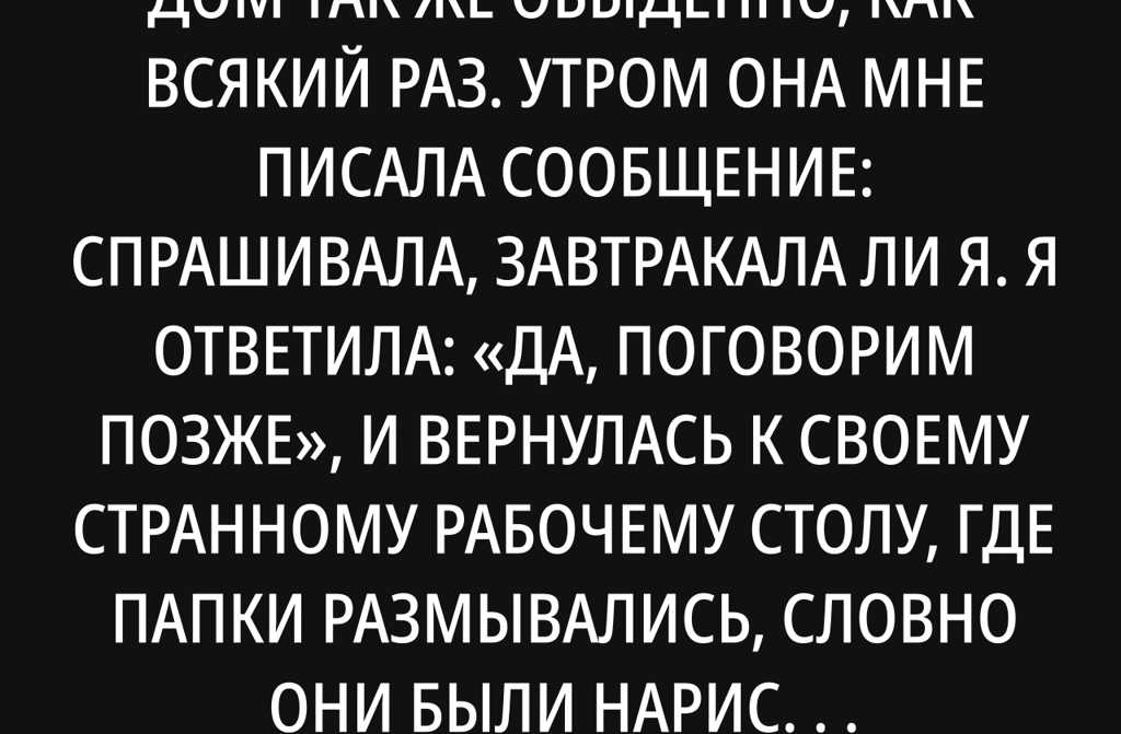 На днях моя мама покинула дом так же обыденно, как всякий раз. Утром она мне писала сообщение: спрашивала, завтракала ли я. Я ответила: «Да, поговорим позже», и вернулась к своему странному рабочему столу, где папки размывались, словно они были нарисованы водой. Она не болела, не лежала в больнице, тревоги нигде не витали, прощание не тянулось сырой лентой. Это был самый заурядный день. Один из тех дней, что кажутся прозрачными, будто не способны сдвинуть ни один камень внутри.
