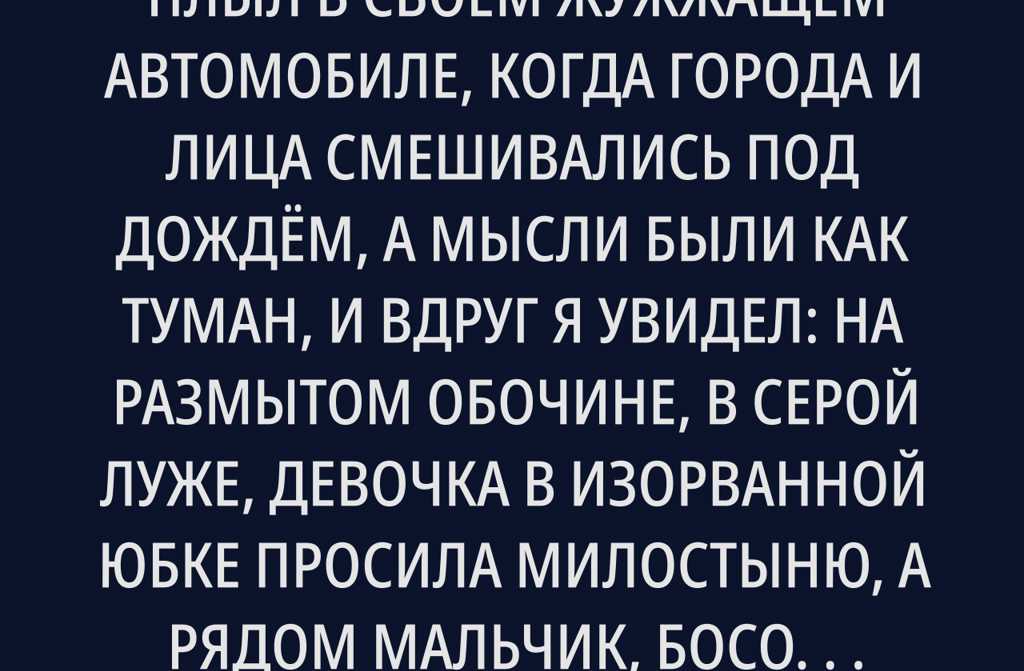 По проспекту Леси Украинки я плыл в своем жужжащем автомобиле, когда города и лица смешивались под дождём, а мысли были как туман, и вдруг я увидел: на размытом обочине, в серой луже, девочка в изорванной юбке просила милостыню, а рядом мальчик, босой, с лицом, как выцветшая икона. Я проснулся во сне, ткнул себя, но утро не наступало это была моя дочь, Марьяна, с внуком Ярославом.