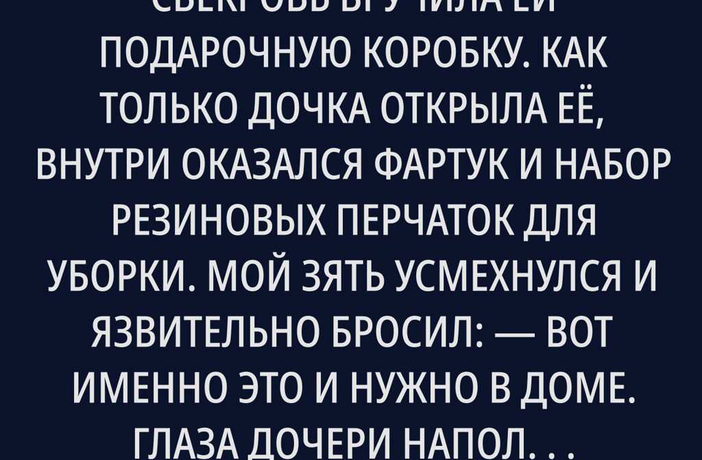 На свадьбе моей дочери её свекровь вручила ей подарочную коробку. Как только дочка открыла её, внутри оказался фартук и набор резиновых перчаток для уборки. Мой зять усмехнулся и язвительно бросил: