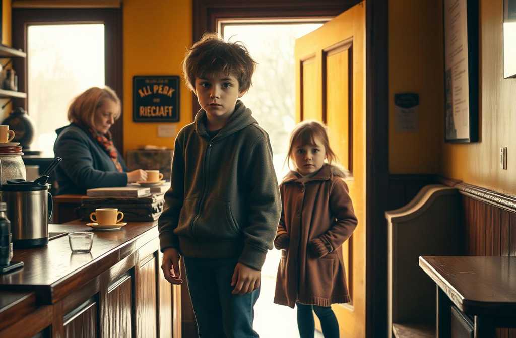 Дверной колокольчик звякнул. Порыв ледяного воздуха ворвался вместе с двумя фигурами: высокий, худой подросток с впалыми щеками и стоптанными кроссовками, державший за руку маленькую девочку. Их волосы были спутаны, лицо ребенка прижато к нему, будто она пряталась от всего мира.