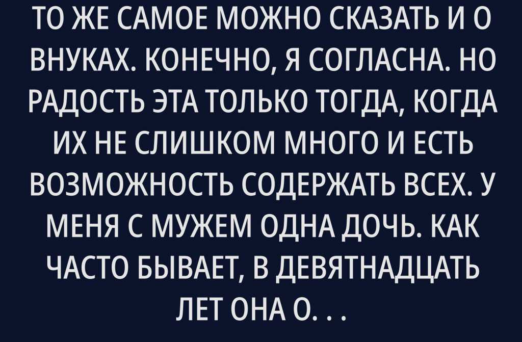 Говорят, что дети это счастье. То же самое можно сказать и о внуках. Конечно, я согласна. Но радость эта только тогда, когда их не слишком много и есть возможность содержать всех. У меня с мужем одна дочь. Как часто бывает, в девятнадцать лет она обескуражила нас новостью: беременна и скоро станет мамой. Родила сразу двойню. Вышла замуж.