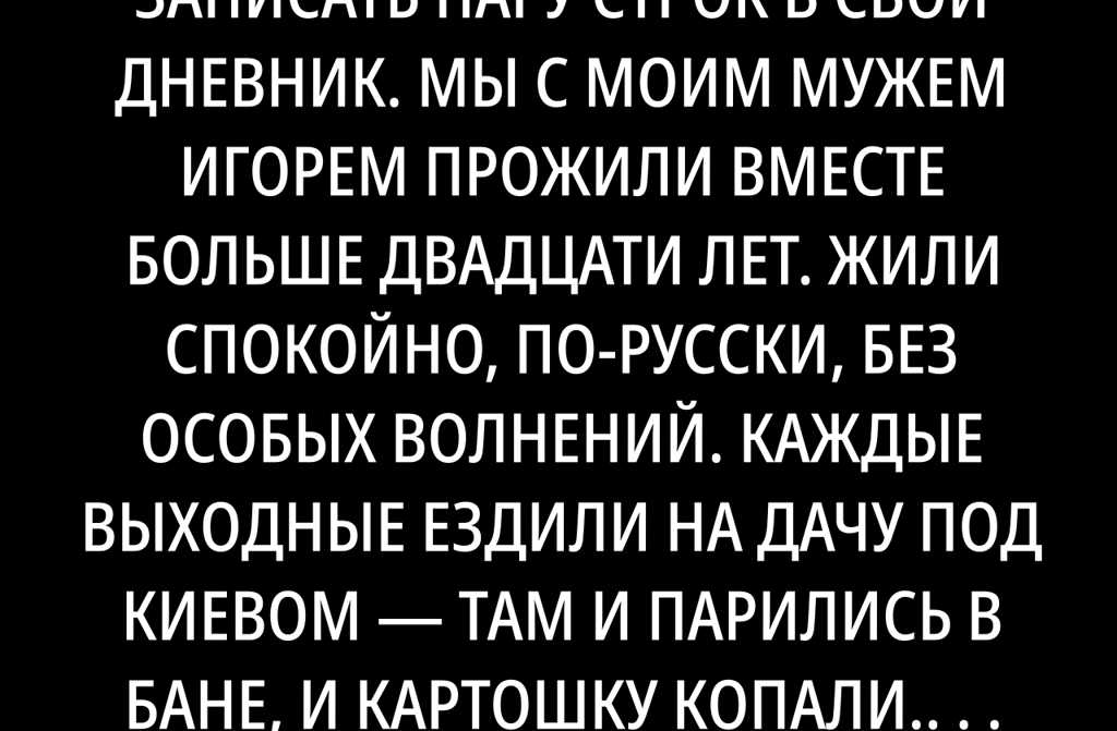 Сегодня я решила снова записать пару строк в свой дневник. Мы с моим мужем Игорем прожили вместе больше двадцати лет. Жили спокойно, по-русски, без особых волнений. Каждые выходные ездили на дачу под Киевом там и парились в бане, и картошку копали. Игорь всегда помогал по дому: убирался в квартире, а я готовила на всех. Я была уверена, что вместе мы и состаримся, тихо и мирно, как наши соседи Григорий Павлович с Валентиной Семёновной.
