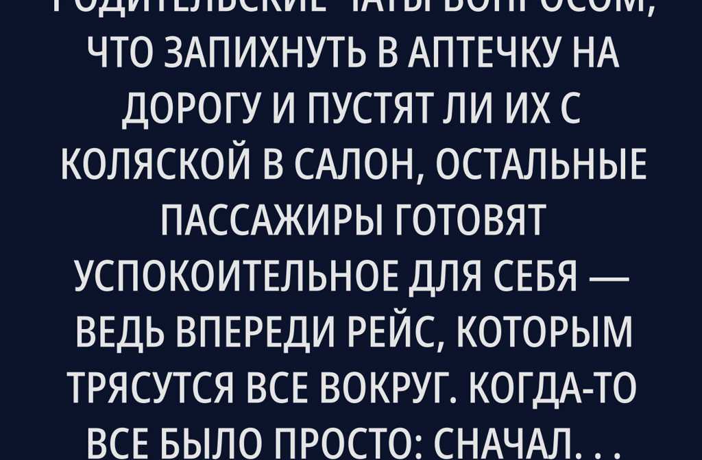 Пока мамы взрывают родительские чаты вопросом, что запихнуть в аптечку на дорогу и пустят ли их с коляской в салон, остальные пассажиры готовят успокоительное для себя ведь впереди рейс, которым трясутся все вокруг. Когда-то все было просто: сначала пытались пристыдить тех, кто хмурится на детей дети, мол, цветы жизни! Теперь уже авиакомпании чуть ли не просят устанавливать отдельные таблички посадить родителей с детьми отдельно от остальных смертных. Как вообще мы до такого докатились?