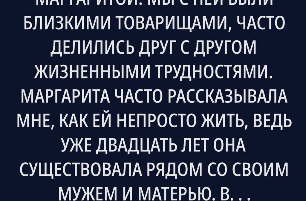 Я много лет дружил с Маргаритой. Мы с ней были близкими товарищами, часто делились друг с другом жизненными трудностями. Маргарита часто рассказывала мне, как ей непросто жить, ведь уже двадцать лет она существовала рядом со своим мужем и матерью.