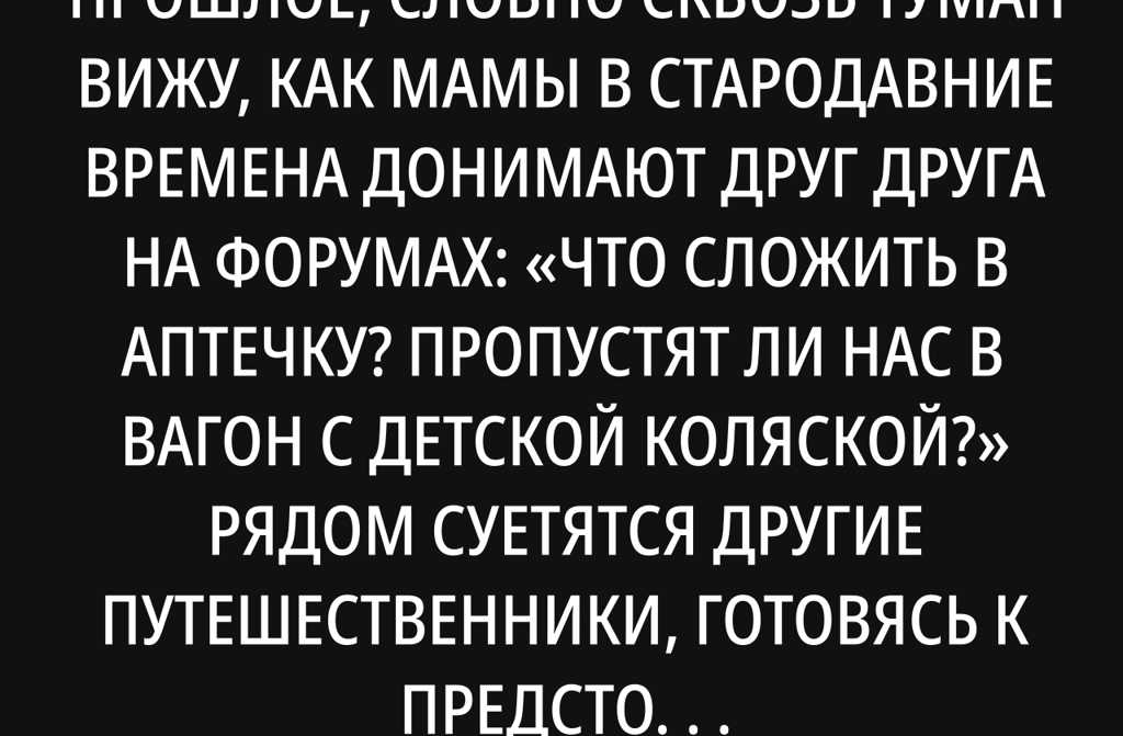 Когда я теперь вспоминаю прошлое, словно сквозь туман вижу, как мамы в стародавние времена донимают друг друга на форумах: «Что сложить в аптечку? Пропустят ли нас в вагон с детской коляской?» Рядом суетятся другие путешественники, готовясь к предстоящей нервотрёпке в дороге. Сейчас ведь всё понятно стоит хоть раз возмутиться тем, что детей якобы надо держать под постоянной опекой и заботой, как тут же на авиалинии сыплются предложения выделить отдельные салоны, лишь бы взрослые и дети не встречались лишний раз. Когда всё это началось?